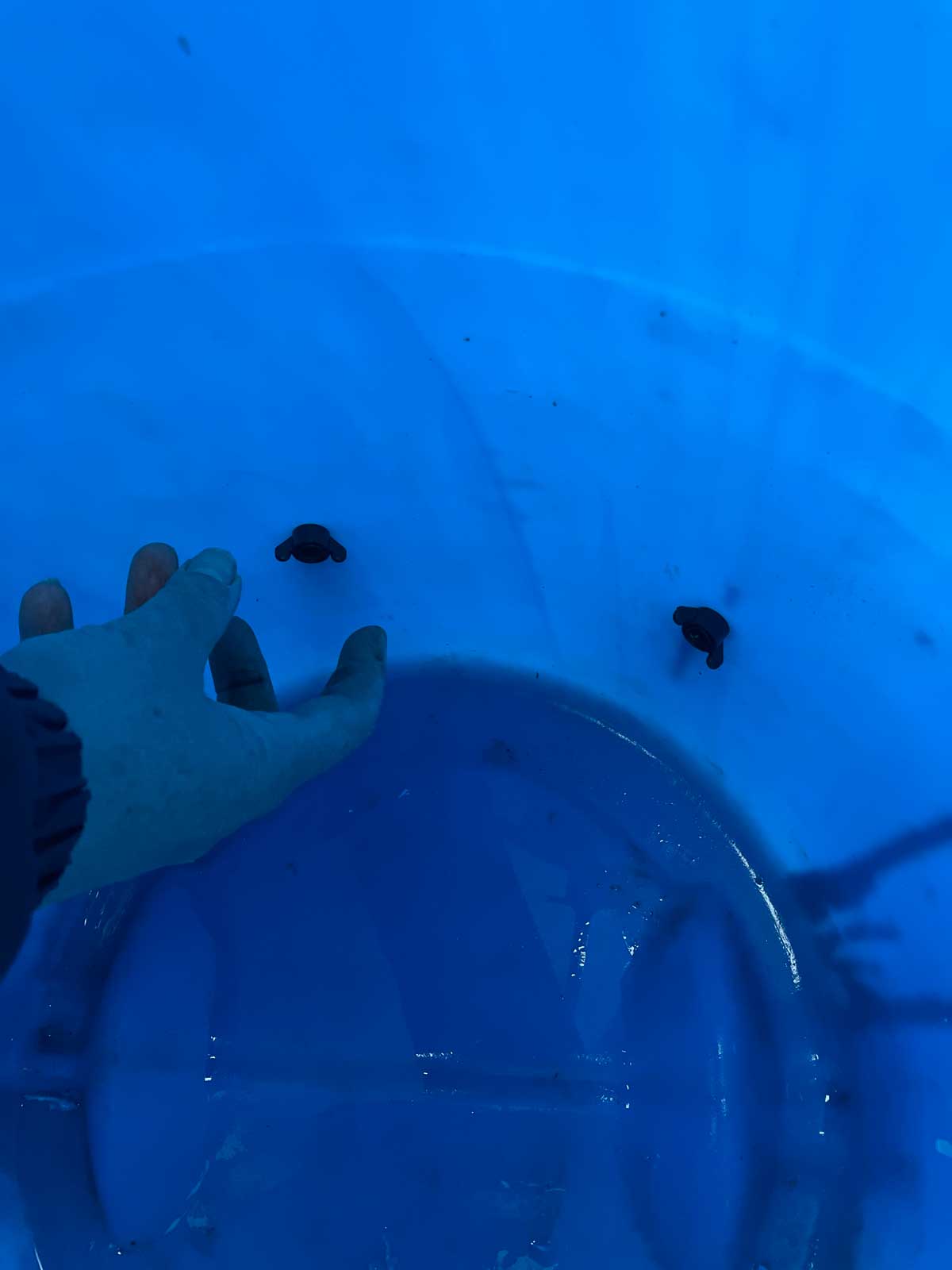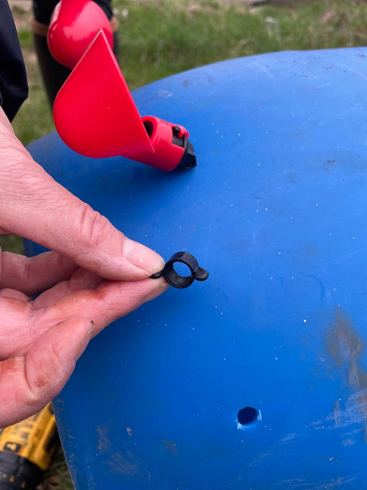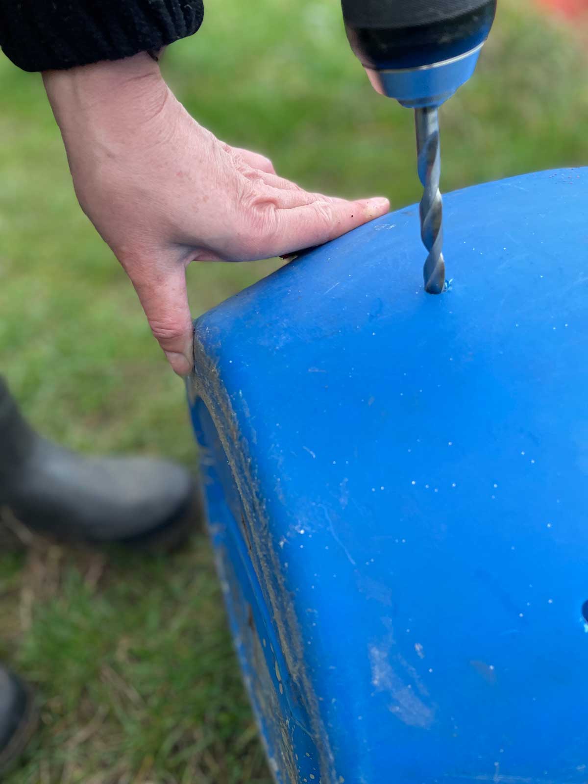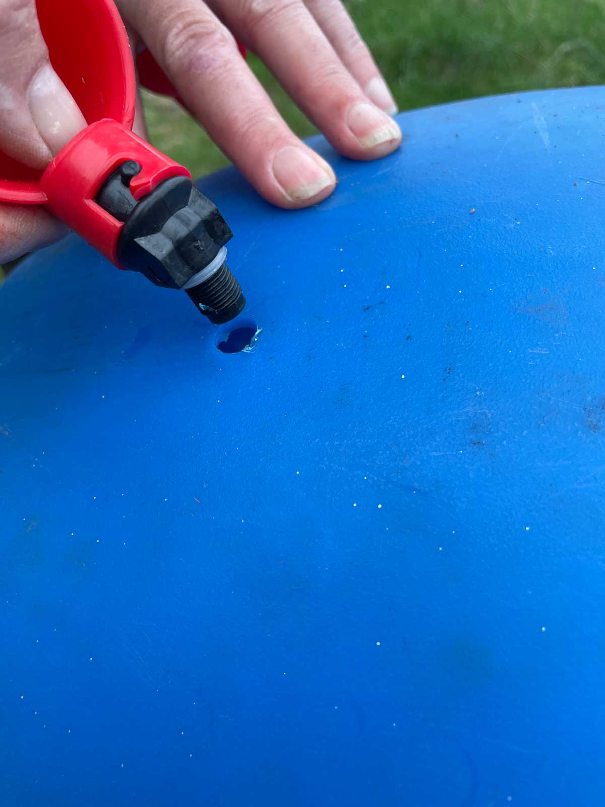 Just drill a hole using a small drill bit, screw the cup to the outside and twist on the plastic wingnut on the inside of your container. When you choose a height to drill the holes, check that the cups will be clear of the ground as they are angled downwards. Pick a height that allows for the water level to be quite low inside the container before it needs a refill. Ours are drilled at 6-10cm from the bottom of the container.